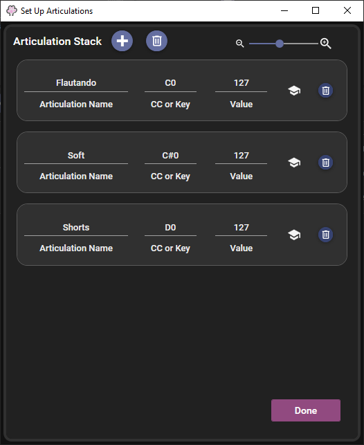 The Articulation Stack setup window allows you to configure a sequence of articulations / sounds that may be a part of a virtual instrument that you're controlling, such as long vs spiccato sounds in a string patch. You can enter a name for the articulation that will show in the main rule header as you play to help remind you where you are!