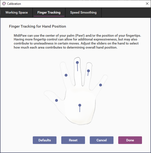By using the sliding controls on the image of the hand in the finger tracking page, you may set the degree to which individual fingertip locations contribute to the calculation of hand position. With sliders pushed up (and that portion of the hand showing less translucent), the corresponding hand part will be considered more heavily in determining overall hand position, while those parts with sliders pushed all the way down will not be considered at all.