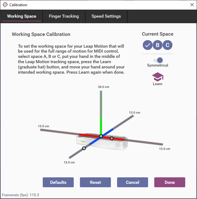 MidiPaw allows you to configure three separate working spaces (slots A, B and C) to easily accommodate users who use their Leap Motions in different locations. Working space distances can be set to be always symmetrical about the center of the Leap Motion, or can be a freeform poisition in space. They can be set only by using the Learn function. To set the working space, select the slot you wish to configure (A, B or C), place your hand directly over and close to the Leap Motion, then press the Learn button and slowly move your hand through the full extent of the area in which you wish to work. You will see the color highlighting where you have moved. This will be the maximum tracked area.