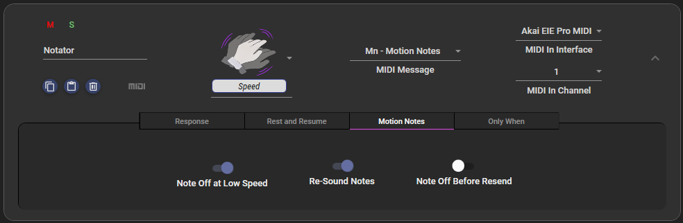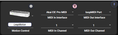 In the case of motion notes, the indicator is replaced by a MIDI interface selection - the motion notes feature will read notes from this interface, but will not pass them through to the MIDI out interface until your hand motion triggers them.