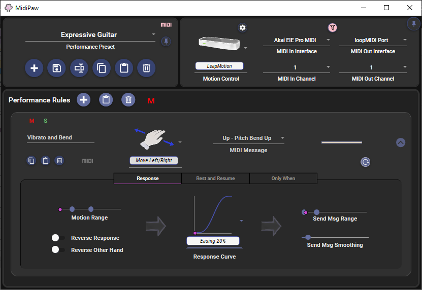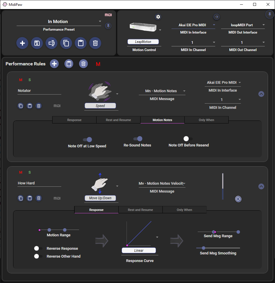MidiPaw operates on the concept of Performance Rules. These rules translate the physical motion of your hand (Paw!) above the Leap Motion Controller in to MIDI messages such as CC (Continuous Controller), pitch bend, channel aftertouch, articulation changes and motion based notes.
