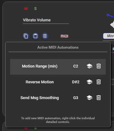 To assist in keeping track of what controls have and do not have automation associated with them, there is a small "MIDI" indicator in the lower left area of the rule header that will light up with pink when automation is configured. Clicking on this indicator will bring up a list of configured automations through which you may update or remove individual settings: