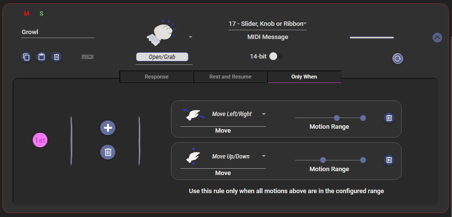 To aid fine tuning, the detailed rule configuration panel includes little pink dots or white circles that slide along the ranges and response curves showing the position of the observed motion. You can achieve best results by setting up the rules while your hand is in motion over the controller, and you are listening to the results by playing the virtual instrument while fine tuning.
