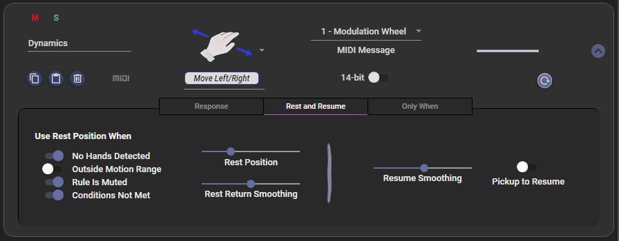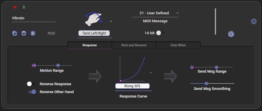 - Like the Reverse Response option, above, but the reversal only occurs when you begin using your other hand. This is most useful for motions like hand twists where twisting inward is intended to increase the CC message with either hand, but can be applied to any motion