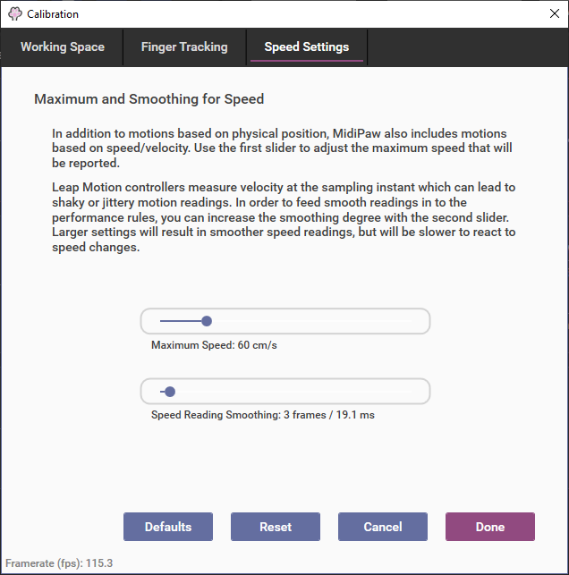 Speed is measured in a particular instant by the Leap Motion, and this setting allows you to select a degree of smoothing or averaging before the speed is processed through the performance rules that use speed-based motions. This can greatly improve the stability and playability of the related motions.