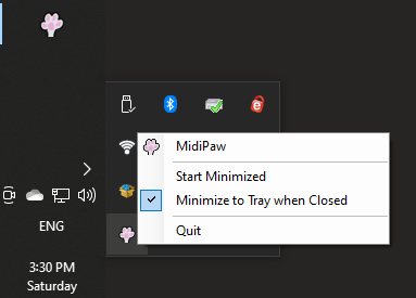 This setting may be changed by right-clicking on the tray icon for MidiPaw where it may be enabled, along with electing whether to start minimized. Clicking on the tray icon or on the MidiPaw menu item in the context menu will restore MidiPaw's window to the screen.